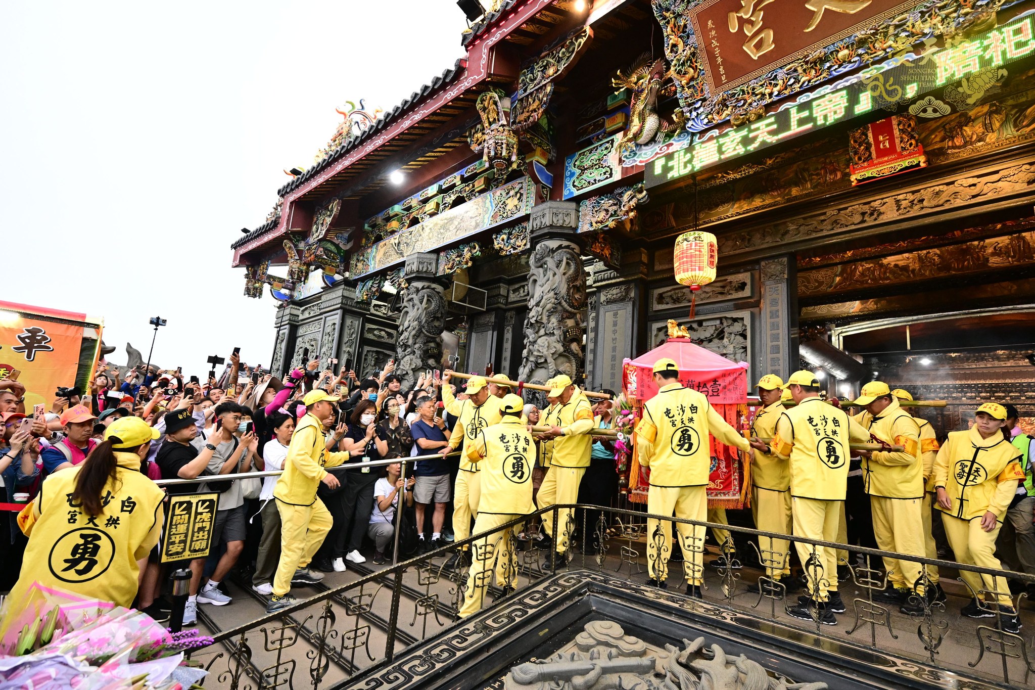 上午媽祖鑾轎進入南投名間鄉,沿途信眾夾道歡迎,場面熱烈感人,傍晚約17點56分 媽祖鑾轎「粉紅超跑」抵達松柏嶺受天宮駐駕,與玄天上帝相見歡,成為香燈腳津津樂道的珍貴畫面。